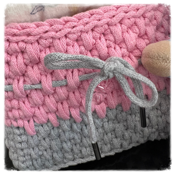 Panier de rangement pour les couches de bébé en coton de jersey bio bicolore rose et gris.