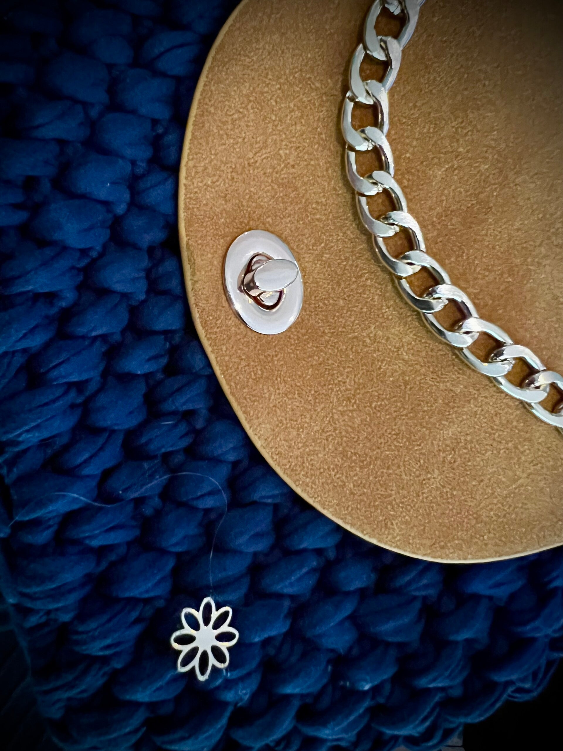 Bandouillière en cuir et petite chaine en acier inoxydable dorée pour le porter au poignet.