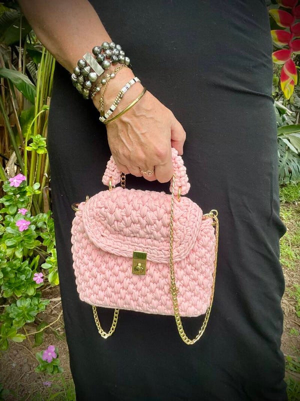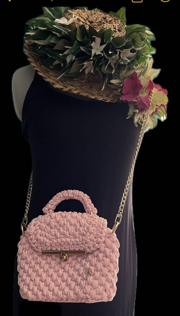 Découvrez notre magnifique petit sac à main en crochet, fabriqué en jersey de coton bio saumon, qui évoque les sables roses du splendide lagon de Fakarava. Ce sac ne se contente pas d’être un accessoire tendance ; il est également éco-responsable, alliant style et respect de l'environnement.