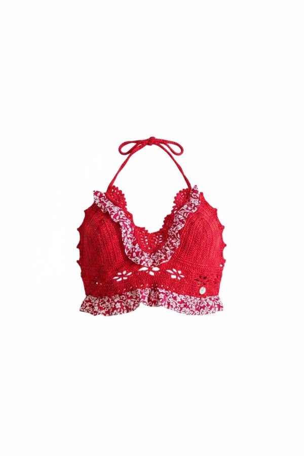 Top rouge en coton mercerisé bio et un fil lurex pour un effet brillant et scintillant dans un joli point ajouré pour mettre votre poitrine et votre tenue en valeur.