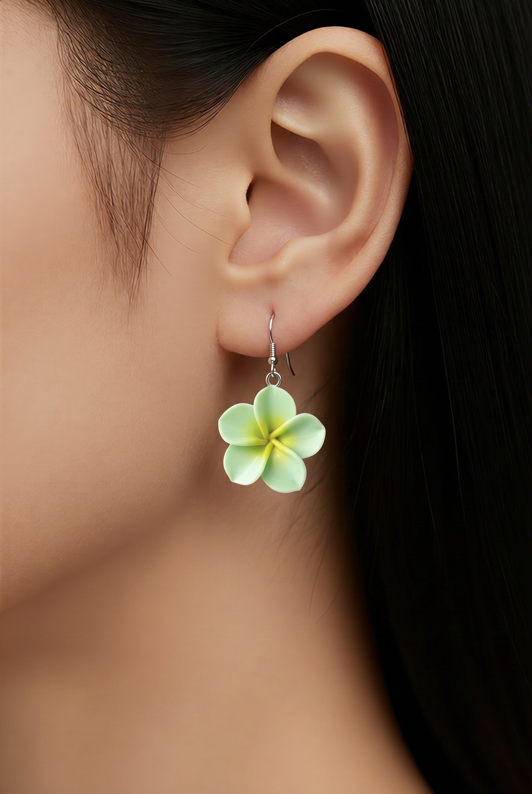 Découvrez nos boucles d’oreilles avec tige en acier inoxydable, ornées d'une délicate petite fleur de tiare Tahiti verte .
